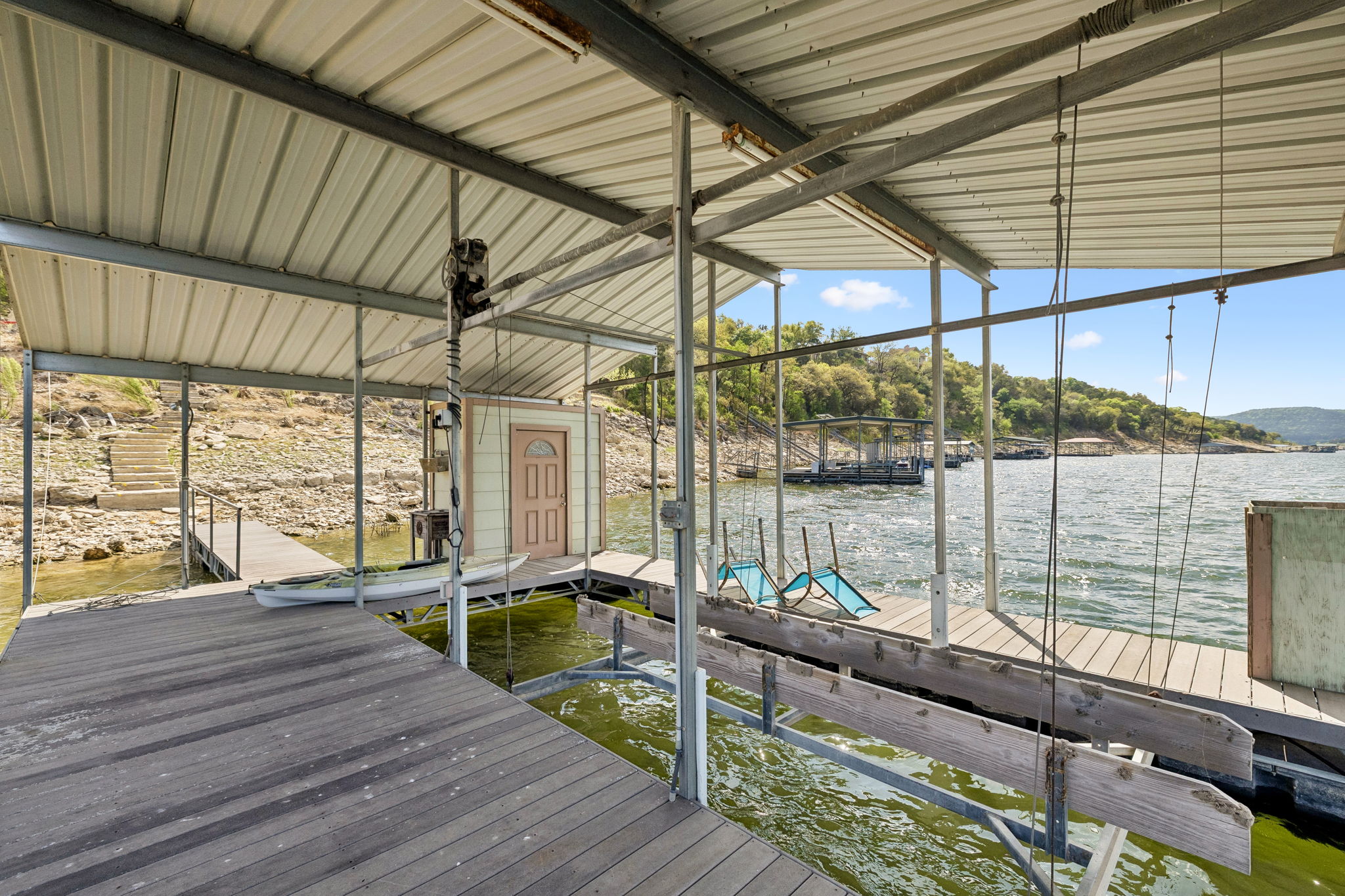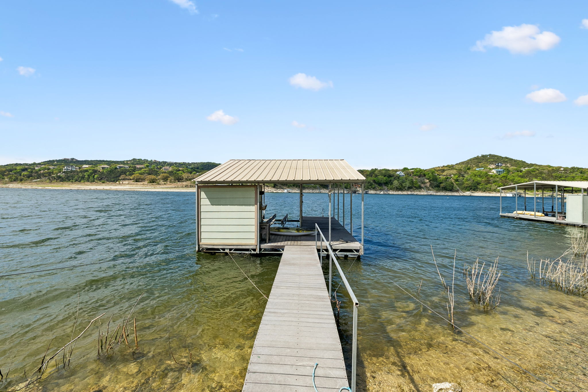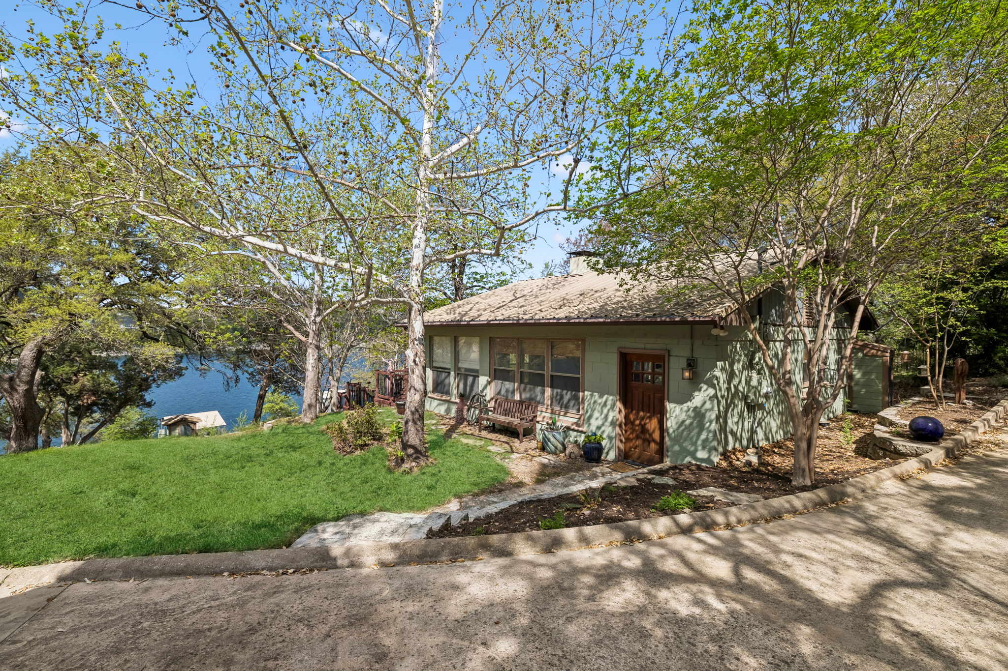 Classic lake cabin. Covered floating dock. Room to enjoy now—and build later. This former 1960s fishing cabin sits right on 150’ of Lake Travis shoreline and 1.5 acres, delivering the kind of easy water access and laid-back setting people remember from summers at the lake. The property has been thoughtfully updated to preserve its original character while keeping the focus on what matters most—time outside, time on the water, and time together. Step out back and the lifestyle becomes obvious. A large shaded deck faces the lake, creating the perfect place for slow mornings, sunset dinners, or weekends with friends. Just beyond, your covered floating dock makes boating, fishing, and swimming simple. A substantial stone fireplace in the yard anchors evenings outdoors, while a separate stone pad provides the ideal spot for grilling with wide views up and down the lake. Inside, the home keeps its lodge-style charm with rough-hewn wood trim, abundant windows, and a decorative stone fireplace that sets the tone for relaxed lake living. Sleeping areas are positioned to capture lake views, and the open layout brings the outdoors into every room. The property also offers flexibility for the future. Whether used as a weekend getaway, full-time retreat, or guest quarters for a new home built higher on the lot, the setting supports multiple possibilities. A large storage shed plus additional smaller sheds—including one on the dock—provide practical space for tools, gear, and lake toys. Tucked behind mature trees with a wooded reserve across the street, the property feels quiet and private—yet remains just minutes from the restaurants, shopping, and daily conveniences of Cedar Park. Voluntary HOA membership offers access to additional lakefront amenities, including a boat ramp. Dock in place. Outdoor living ready. Future potential built in. This is Lake Travis living the way it started—simple, peaceful, and centered on the water.