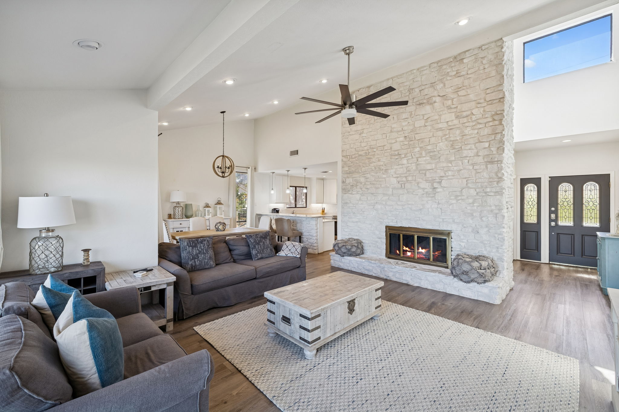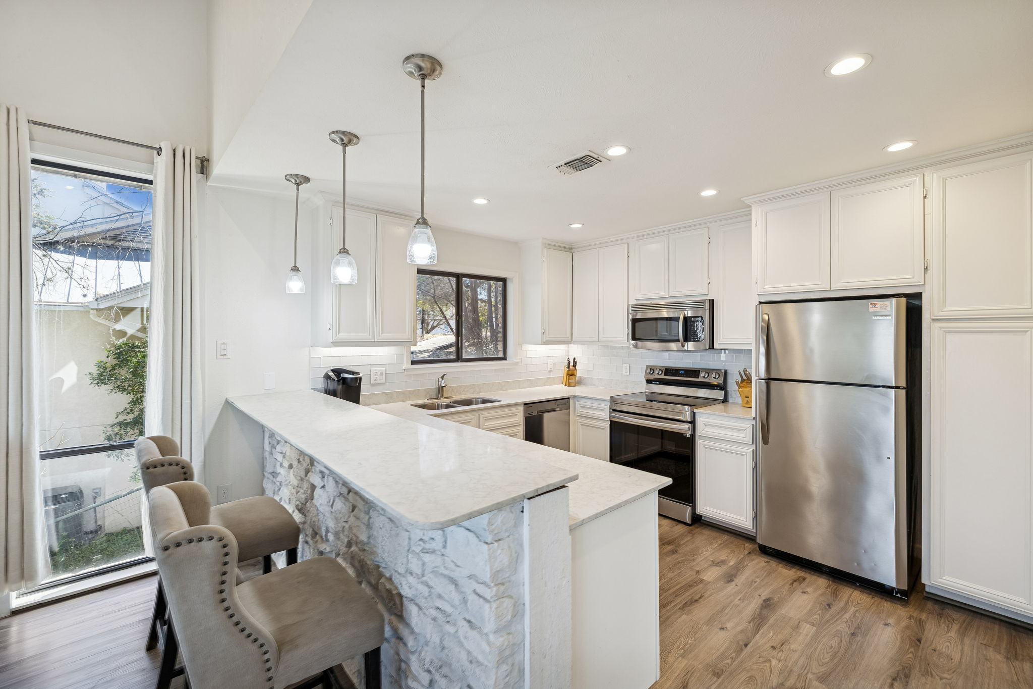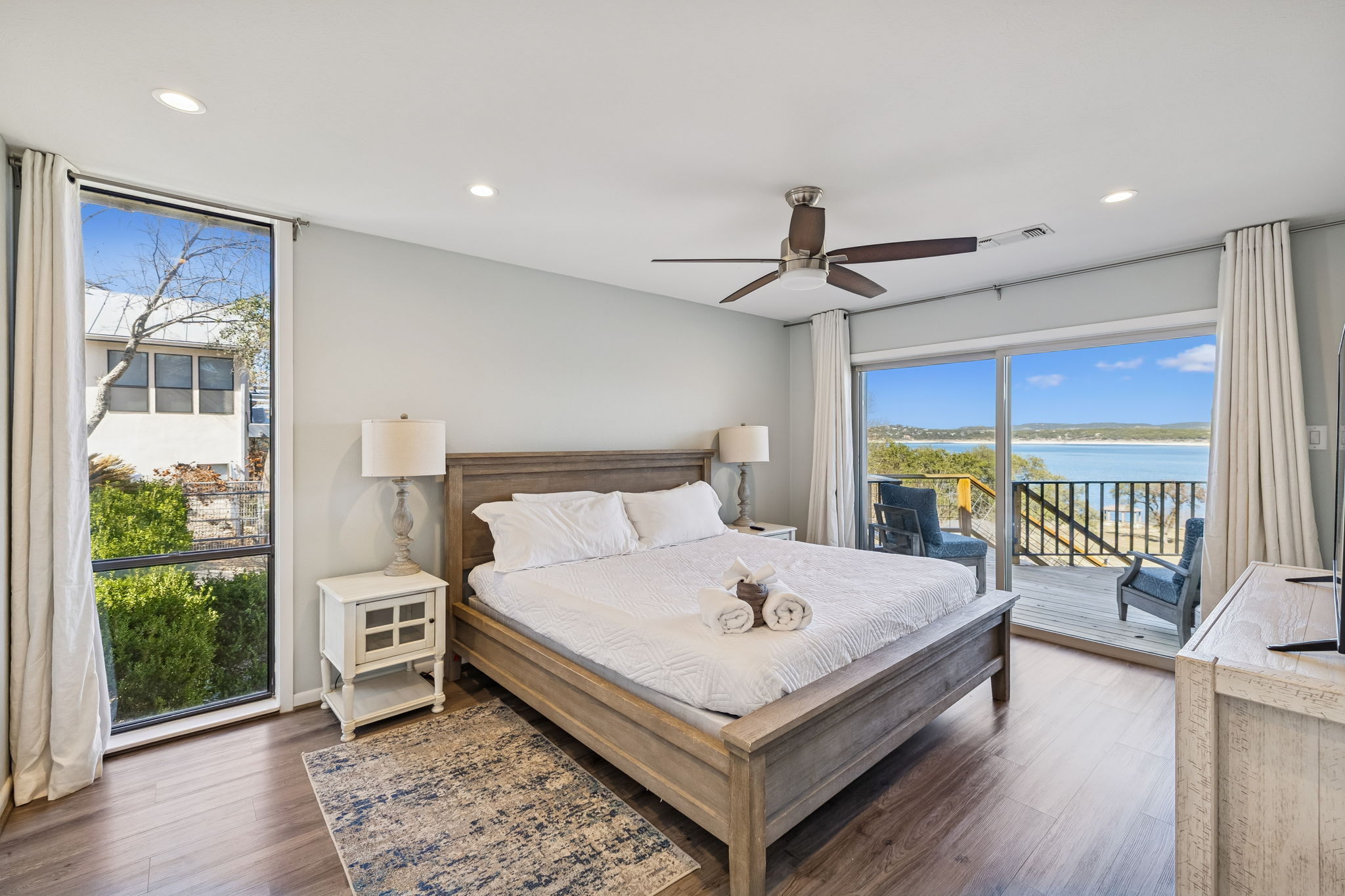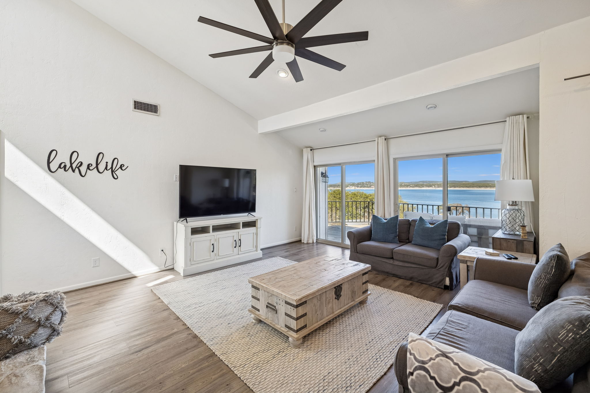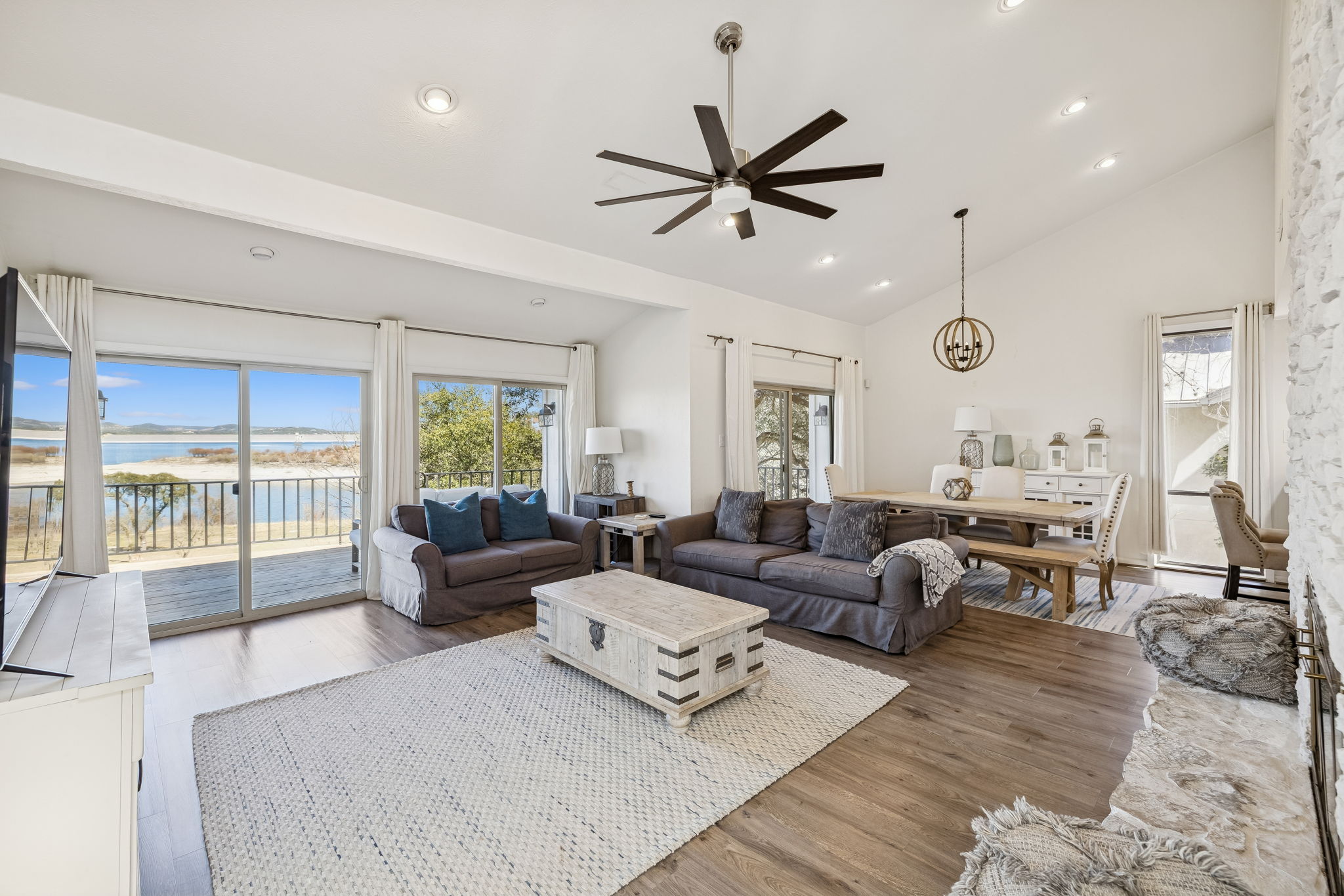 True Canyon Lake waterfront. Unobstructed views. Renovated and ready. Perched above the shoreline with sweeping, panoramic lake views, this Canyon Lake retreat delivers what so few properties can—direct water access, protected sightlines, and a setting that feels both elevated and immersive. The outdoor living is layered and intentional. A partially covered upper deck captures wide-open water views from its prime vantage point, while wrought-iron railing and wood plank flooring add polish. Below, a covered stone patio creates a second gathering space just steps from a gravel trail leading toward the lake. Fully fenced upper and lower yards, stone retaining walls, mature trees, boat/RV cover, and a large storage shed make lake life easy and organized. Inside, the home was fully renovated in 2018 and designed to showcase the view from every room. Large sliding glass doors connect both upper and lower living areas directly to outdoor decks, blending indoor and outdoor living seamlessly. Two separate living rooms—each with a stone wood-burning fireplace—offer flexibility for hosting or multigenerational living. The kitchen features quartz countertops, tile backsplash, under-cabinet lighting, updated electric range (2023), and generous storage. The main-level primary suite offers direct deck access and lake views, while two lower-level bedrooms each open outdoors and include private full baths. Metal roof. Dual HVAC systems (recently replaced). Concrete drive and fenced grounds. This isn’t “near the lake.” It’s real Canyon Lake waterfront—views, access, and privacy all in one.