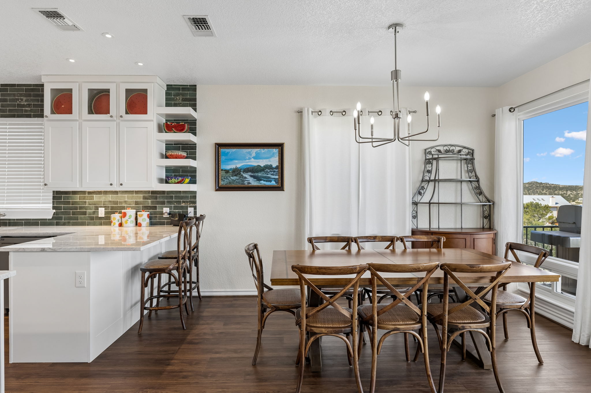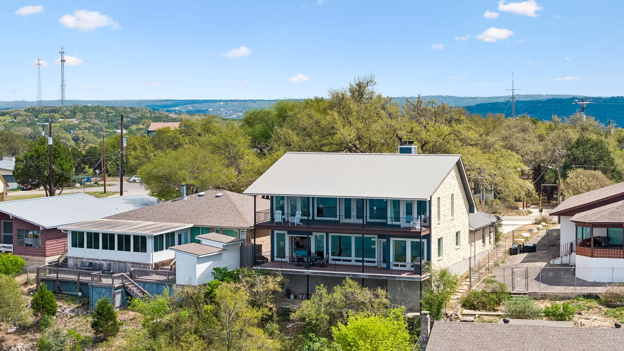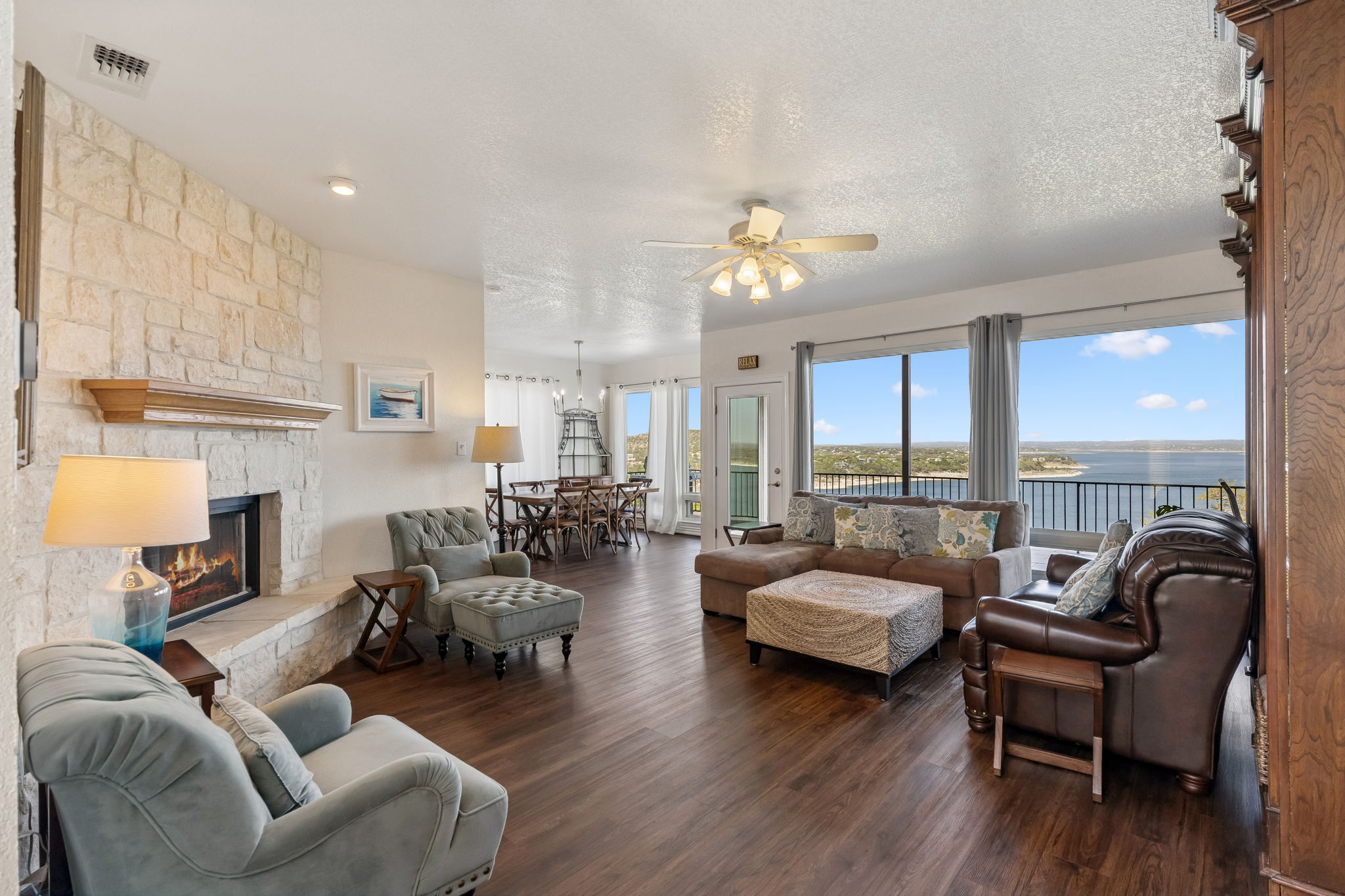 Hilltop views. Fresh air. Canyon Lake living the way people imagine it. This property captures sweeping, unobstructed views across a wide stretch of Canyon Lake—offering the scenery and serenity that make this area so special. Life here naturally moves outdoors. Expansive covered balconies on both levels create the perfect setting for slow mornings, weekends with friends, and sunset evenings that seem to linger a little longer. Mature oak trees provide shade and privacy, while the fenced backyard offers space for pets, play, or simply enjoying the Hill Country surroundings. Inside, the home is bright, open, and built around the view. Large Anderson windows pull natural light into the living spaces, and two wood-burning fireplaces add warmth and character when the weather cools. The remodeled kitchen features quartzite countertops, custom cabinetry, GE Café appliances, and a spacious walk-in pantry—ready for everyday living or hosting a crowd. The primary suite offers peaceful lake views and private outdoor access, while the upstairs living area with wet bar and balcony access creates a relaxed hangout space for guests or family. This is Canyon Lake living centered on views, comfort, and the freedom to enjoy the Hill Country lifestyle every day.